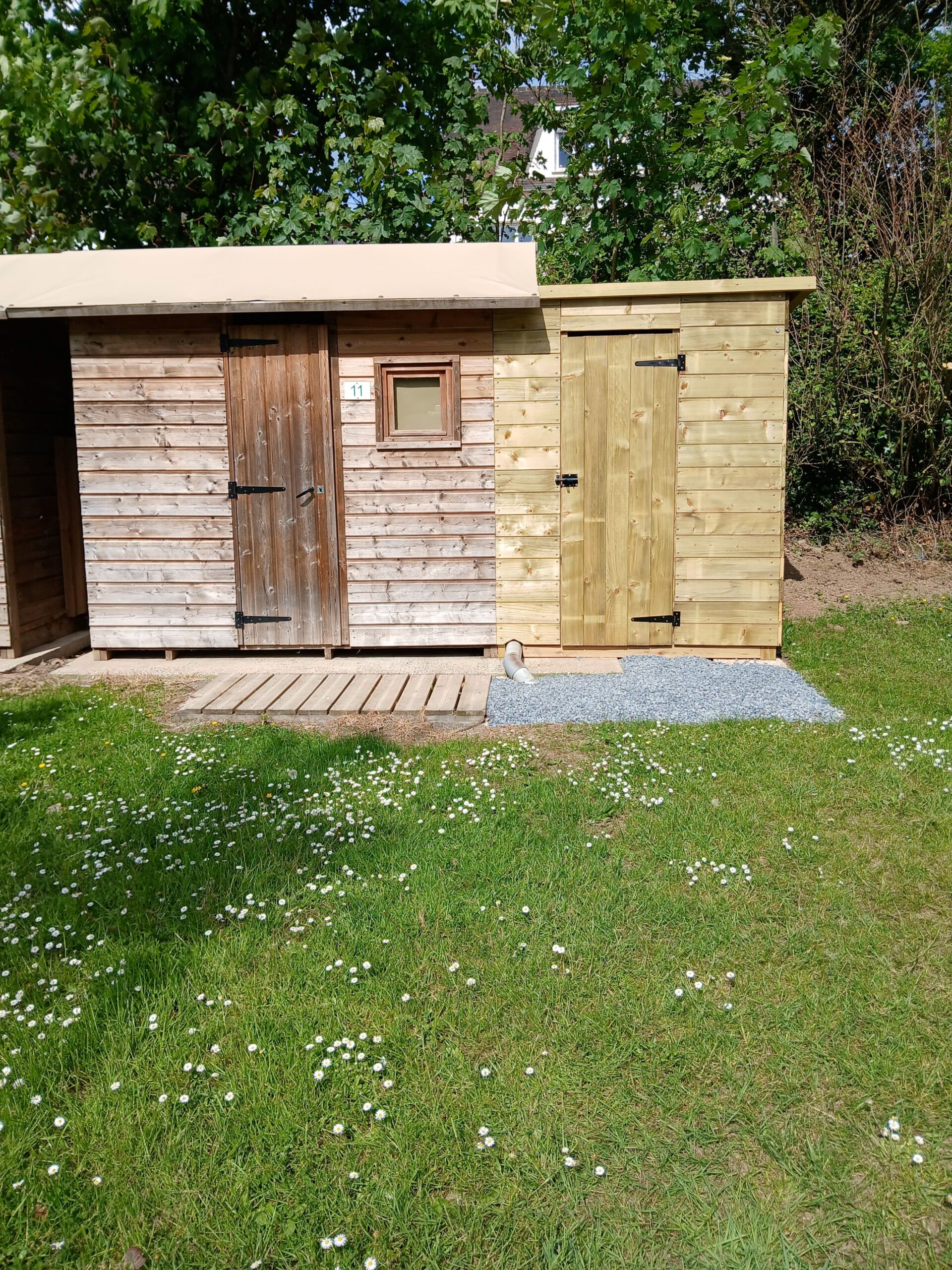 Standplaats voor tent, camper, caravan van ongeveer 80 m2 met een individueel houten chalet inclusief douche, wastafel, toilet en een buitengootsteen voor afwas